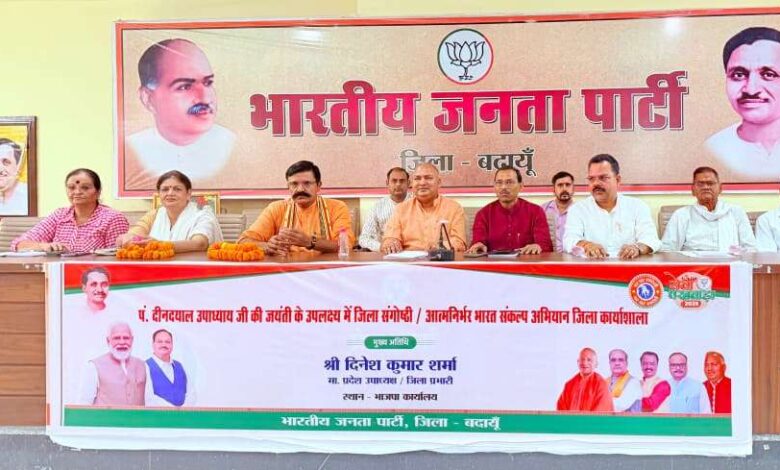 बदायूं। भाजपा कार्यालय पर आत्मनिर्भर भारत संकल्प अभियान की जिला स्तरीय संगोष्ठी का आयोजन किया गया। जिसमें मुख्य अतिथि प्रदेश उपाध्यक्ष व जिला प्रभारी दिनेश कुमार शर्मा, जिलाध्यक्ष राजीव कुमार गुप्ता ने संबोधित किया।